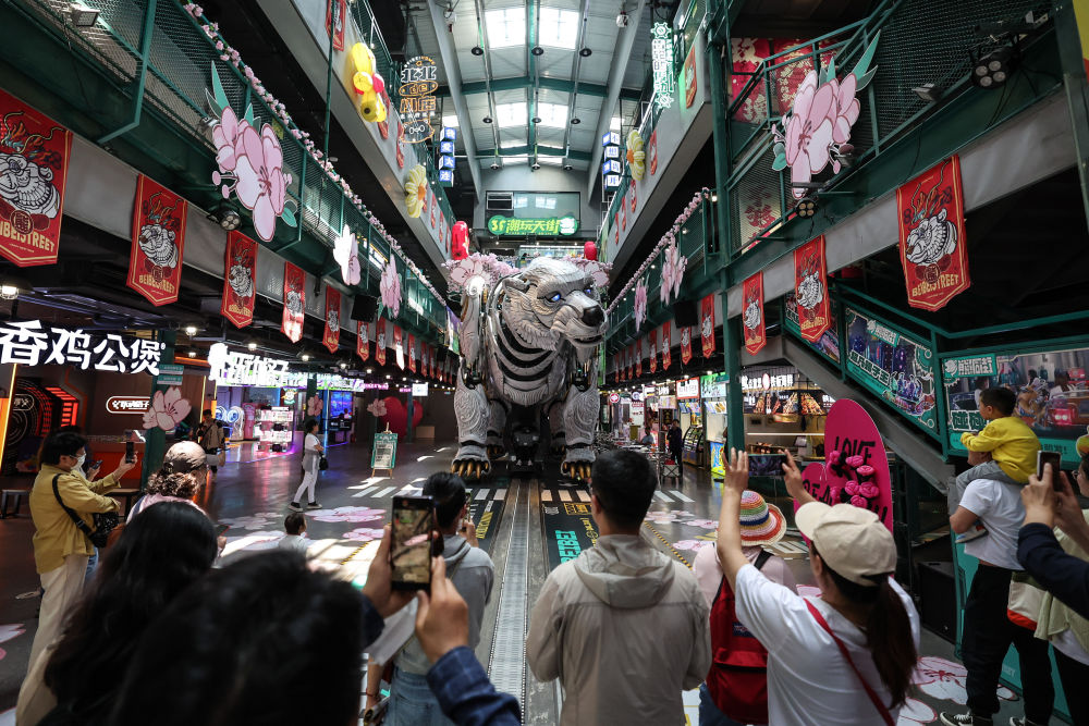 2024年5月22日,游客在大连市冰山慧谷熊洞街观看仿生机械巨熊表演。大连冰山慧谷由原大连冷冻机厂老厂区改造而成,保留了部分工业遗迹,并融入现代文化、创意产业元素,形成了“工业遗产+智慧园区”的特色模式。