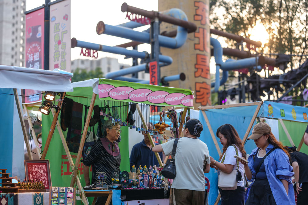 2025年10月1日,游客在沈阳红梅文创园的市集上选购商品。