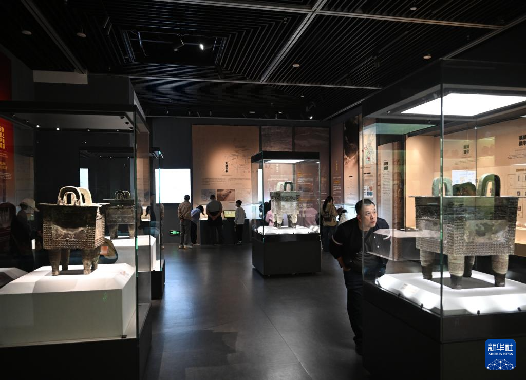 10月3日,游客在郑州商代都城遗址博物院“国宝回家乡——纪念郑州商城发现70周年考古新发现展”上参观杜岭一号方鼎。