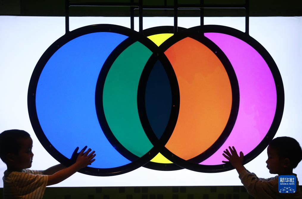 10月3日,小朋友在江苏扬州科技馆体验“三原色的减法原理”。