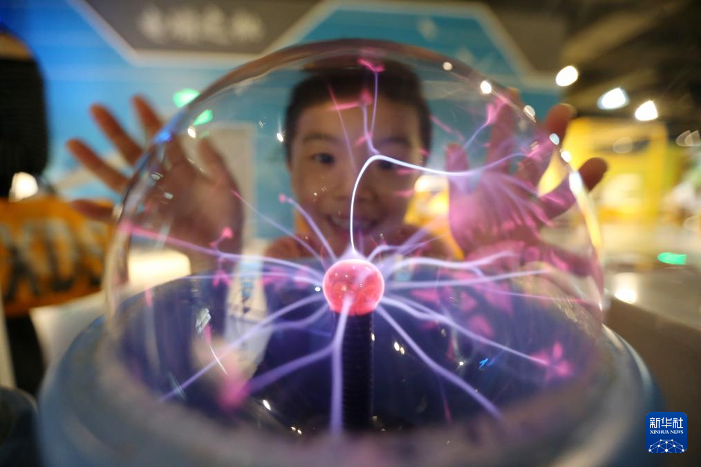 10月3日,小朋友在江苏扬州科技馆体验“辉光球”。