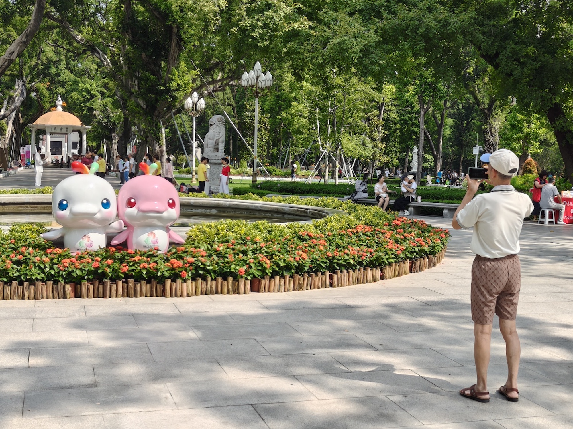 10月10日,游客在广州人民公园的十五运会吉祥物前摄影。实习生 刘玄摄