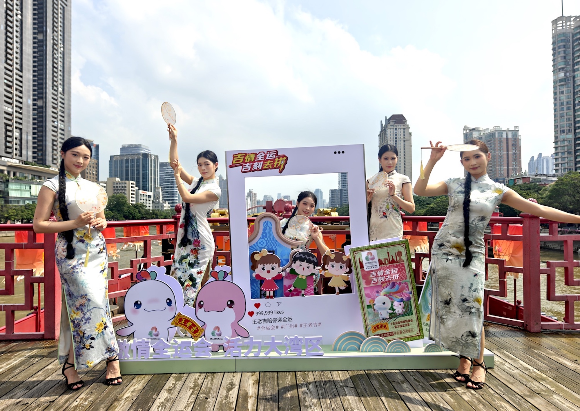 10月10日,广州珠江,舞蹈演员们在客轮上的十五运会打卡装置合影,表达对十五运会的期待。人民网 王雅蝶摄