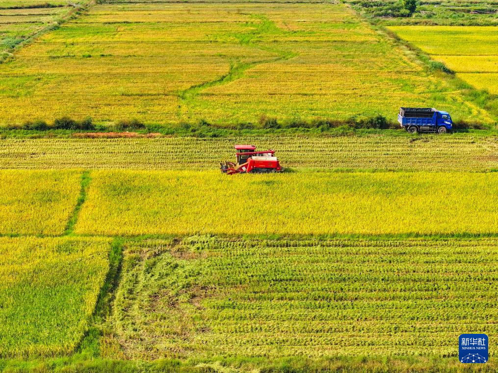 10月11日,湖南省衡阳市衡山县白果镇村民驾驶农机收割稻谷(无人机照片)。