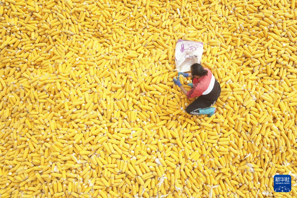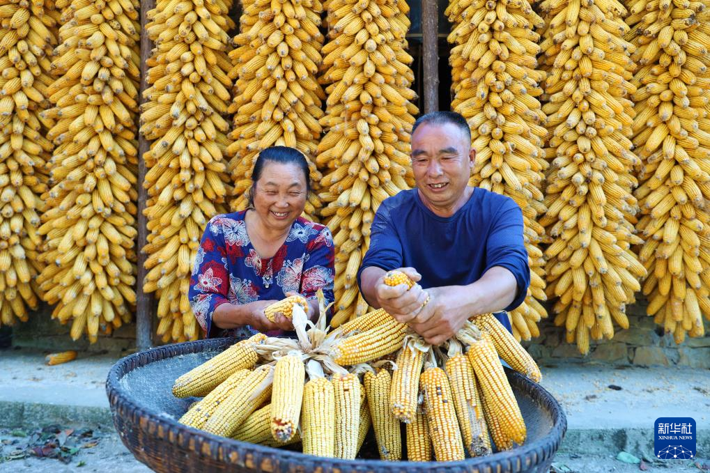 10月11日,云南省文山壮族苗族自治州广南县莲城镇那朵村的农民在晾晒收获的玉米。