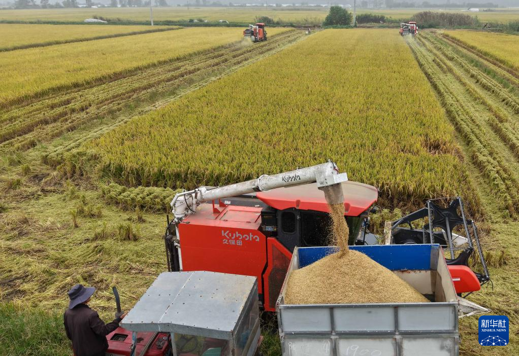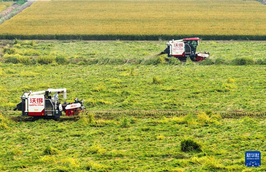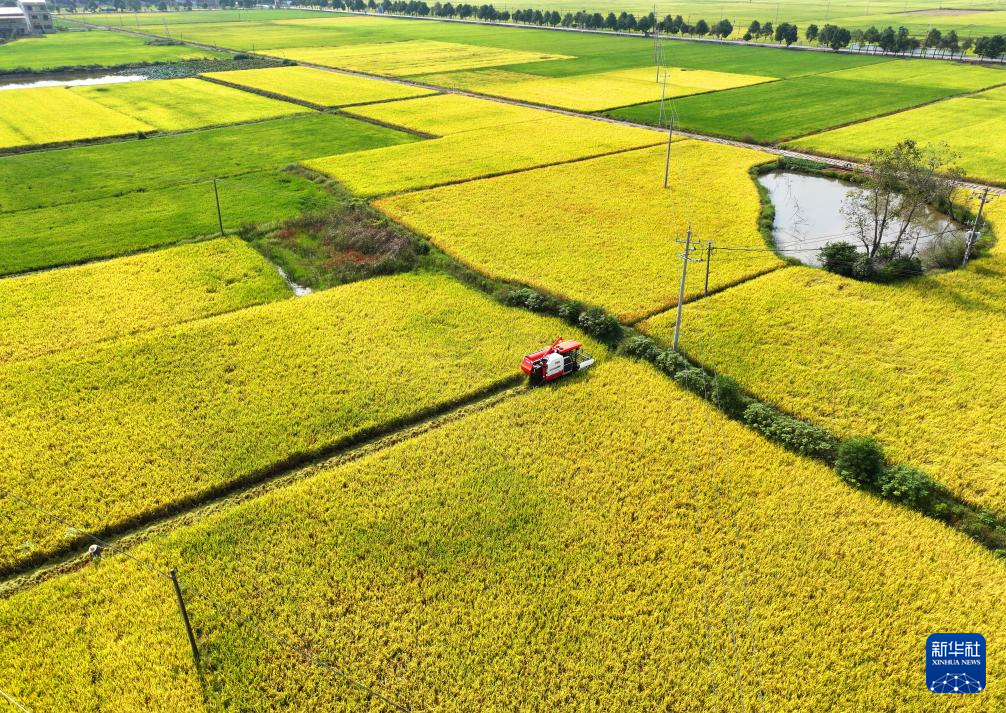 10月11日,在江苏省扬州市邗江区公道镇,农民驾驶农机收割水稻(无人机照片)。