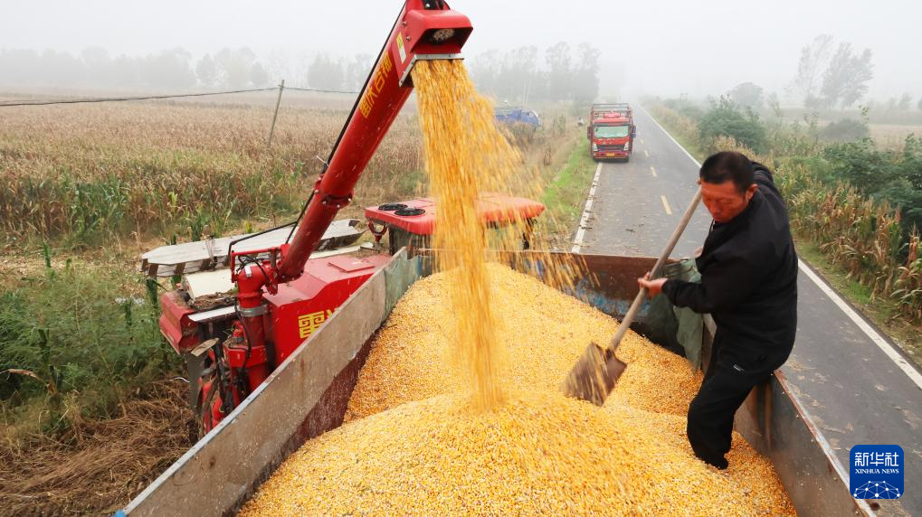 10月11日,河北省唐山市丰润区丰润镇卢各庄村农民整理收获的玉米。