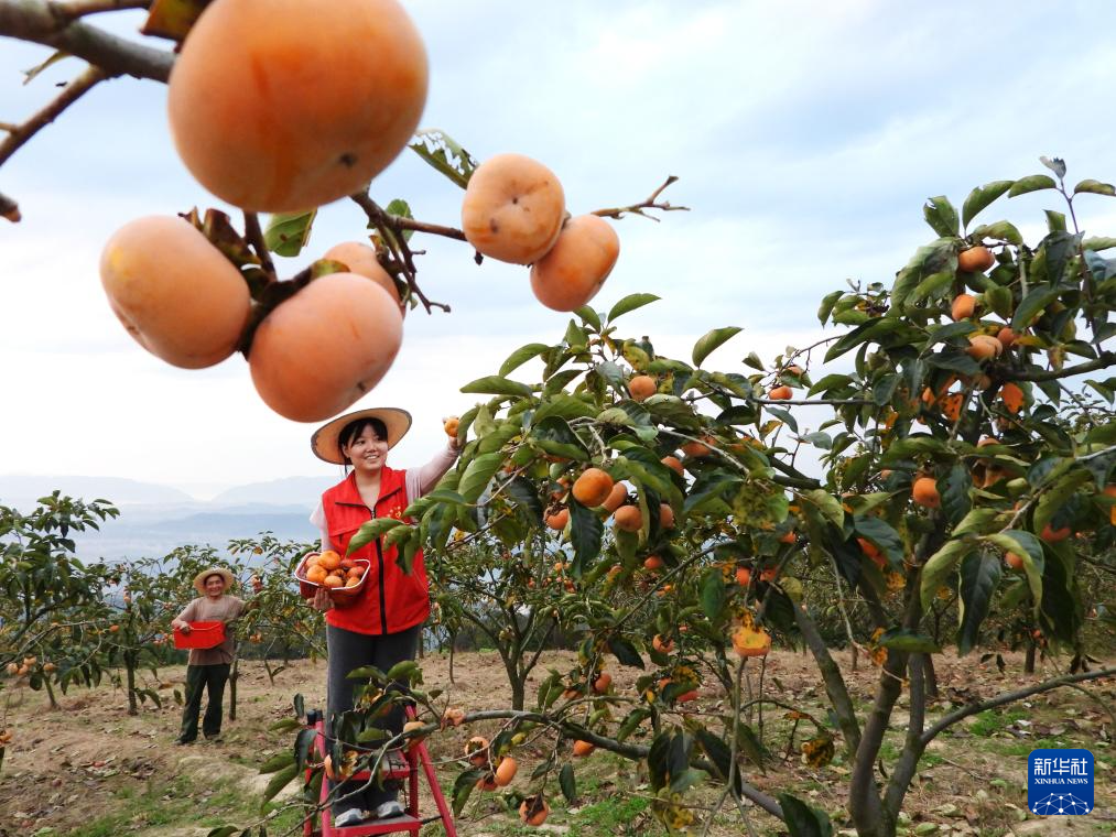 10月11日,在四川省达州市达川区景市镇茶园寺村裕祥家庭农场,柿农和党员志愿者加紧采摘甜柿。