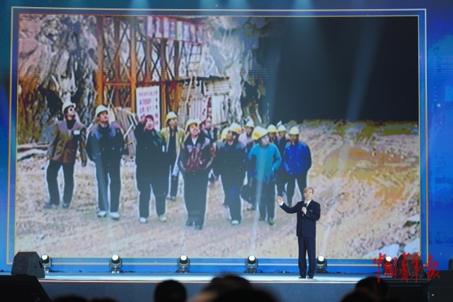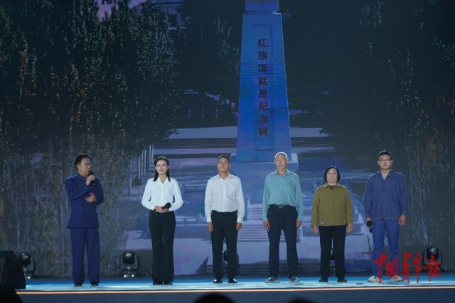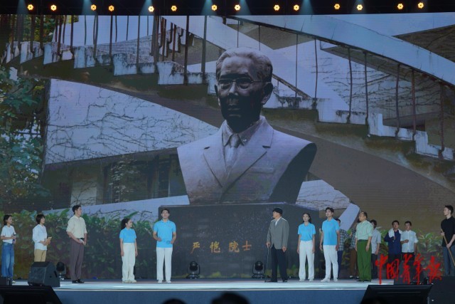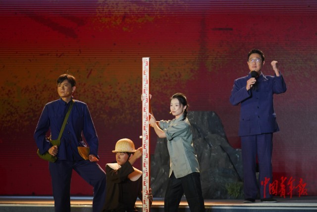 10月12日晚,江苏南京,“把青春华章写在祖国大地上”活动现场,演员林永健(右1)在舞台演绎红旗渠工程设计师吴祖太的故事。1960年3月28日,吴祖太在查看王家庄隧洞险情时,洞顶塌方,不幸牺牲,年仅27岁,是“渠上第一个把命献出去的人”。如今,吴祖太参与设计的362座工程设施仍在发挥作用,红旗渠年均引水量达3.74亿立方米,滋养着54万亩良田。中青报·中青网记者 田嘉硕/摄