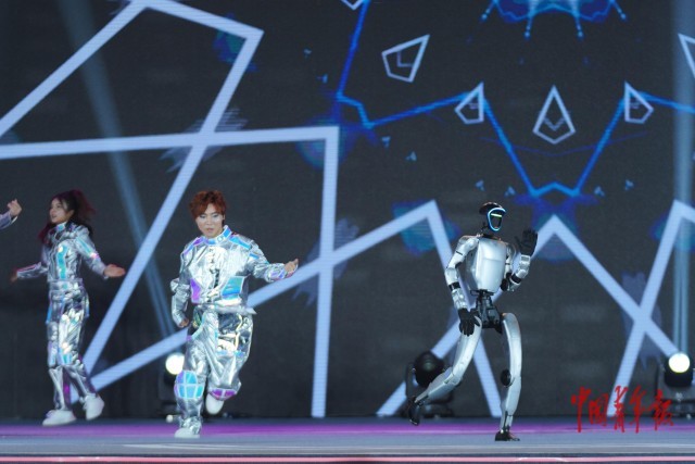 10月12日晚,江苏南京,“把青春华章写在祖国大地上”活动现场,人形机器人与人类共跳街舞。中青报·中青网记者 田嘉硕/摄