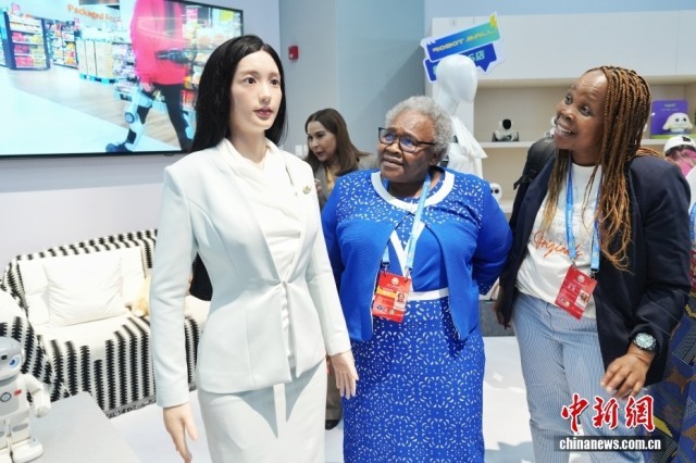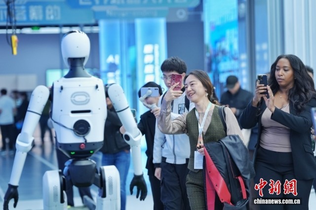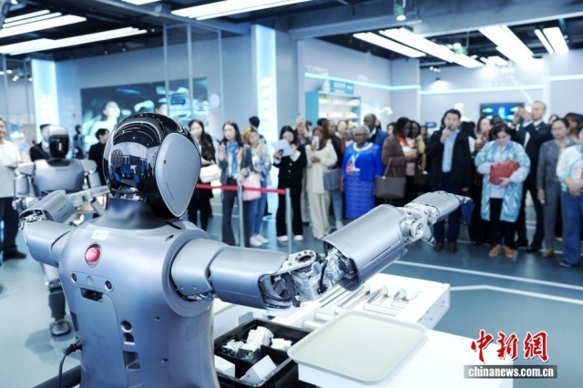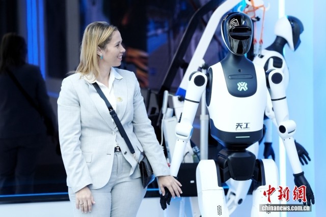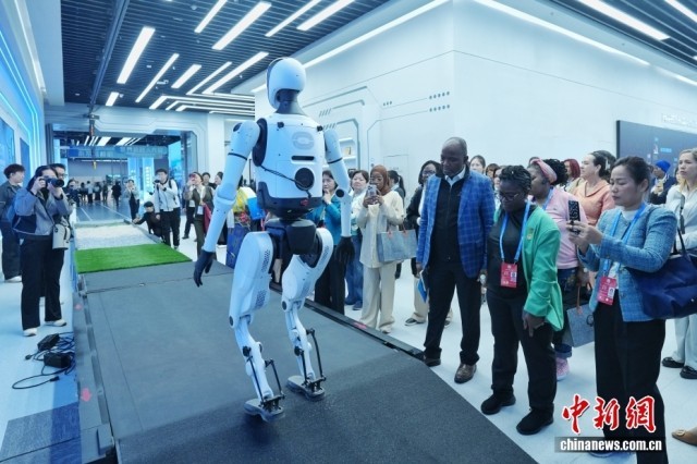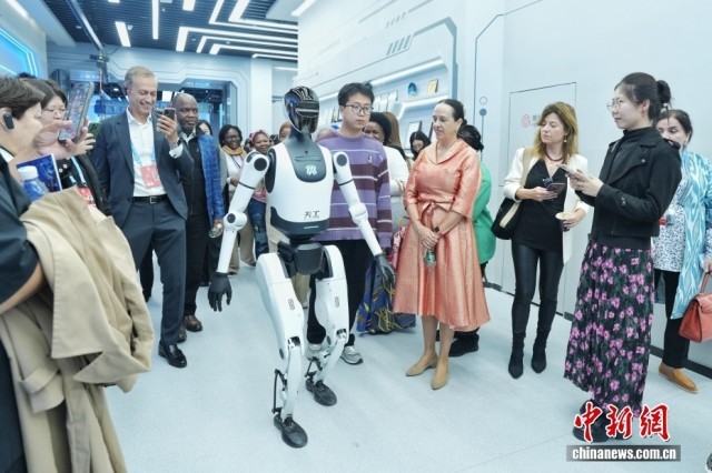 10月14日,参加全球妇女峰会的部分嘉宾参访北京机器人大世界。图为北京人形机器人创新中心的天工机器人吸引嘉宾。