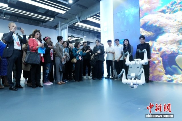 10月14日,参加全球妇女峰会的部分嘉宾参访北京机器人大世界。图为嘉宾在机器人4S店观看四足机器人动作展示。