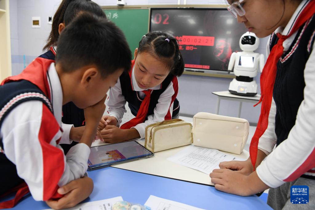 10月15日,在北京市海淀区第四实验小学《闪烁信号》主题人工智能公开课上,学生通过自己编写的程序向机器人发指令。