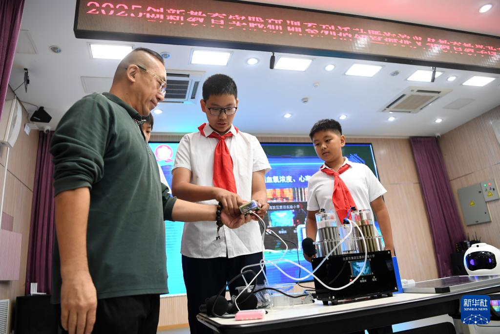 10月15日,在北京市海淀区第四实验小学,人工智能社团的学生用其制作的“极客氢氧太阳能保健机”为现场嘉宾进行健康监测。