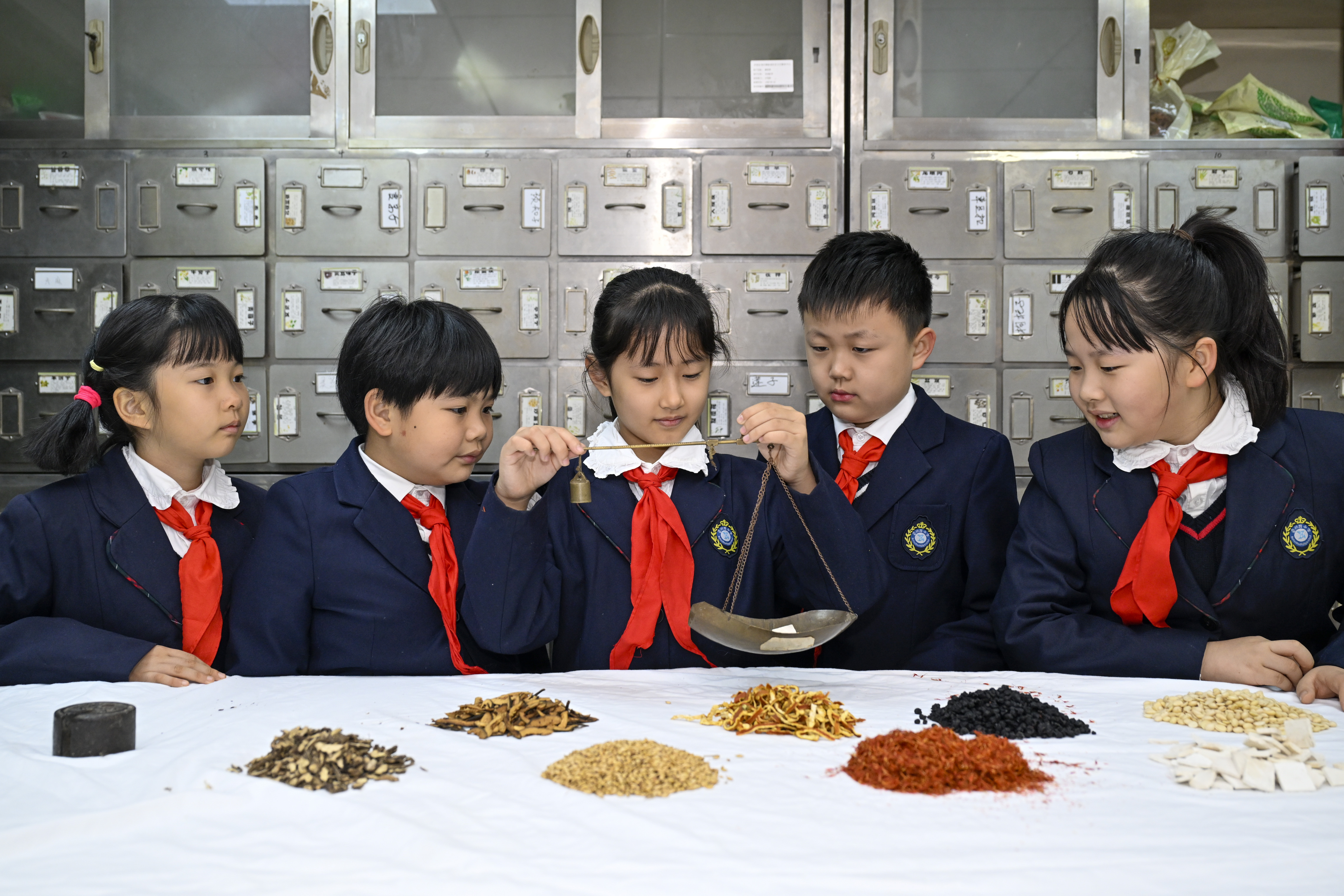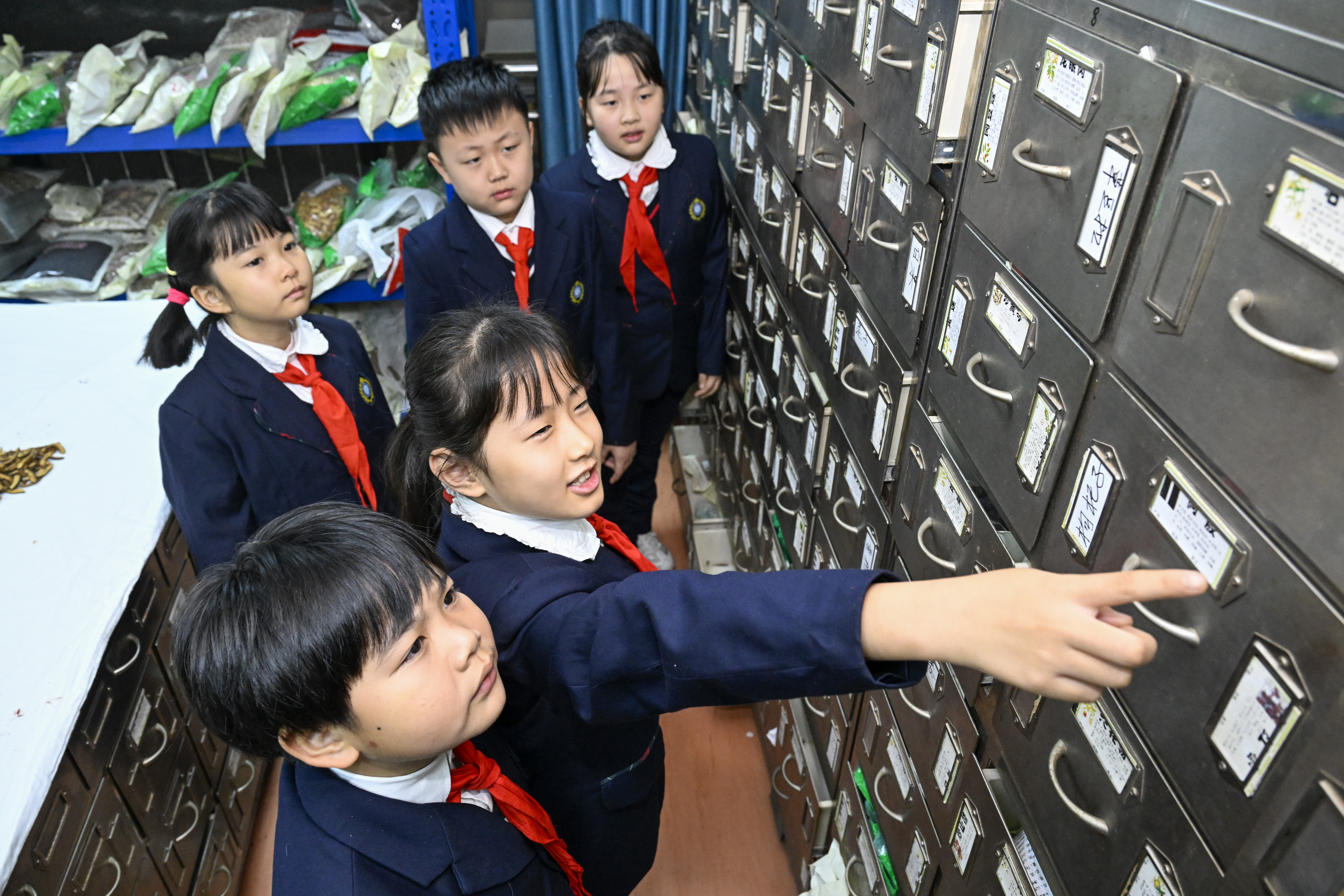 10月20日,在安徽省合肥市庐阳区亳州路社区卫生服务中心,来自亳州路小学的学生正在学习中医知识文化。当日,该校组织学生来到社区卫生服务中心中医馆,参观中药房、学习识别常见中草药,了解艾灸、拔火罐等传统中医治疗方法,感受中医魅力,迎接10月22日世界传统医药日的到来。中国教育报-中国教育新闻网通讯员 赵明 摄