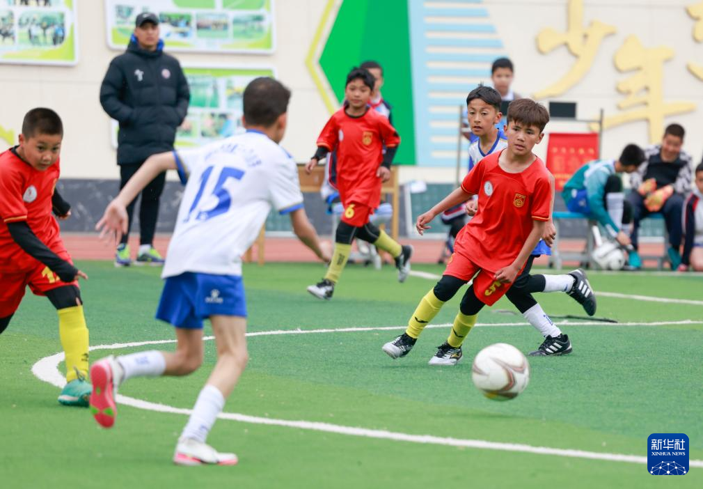 4月16日,在乌鲁木齐市水磨沟区第五届中小学足球联赛中,乌鲁木齐市第121小学足球队队员(红衣)在比赛中。新华社记者 王菲 摄