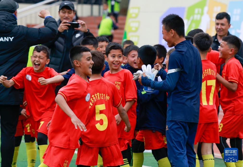 4月16日,在乌鲁木齐市水磨沟区第五届中小学足球联赛中,乌鲁木齐市第121小学足球队赢得比赛后庆祝。新华社记者 王菲 摄