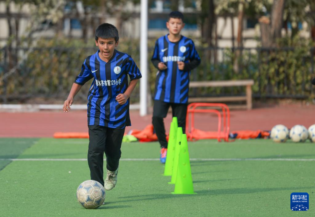 在乌鲁木齐市第121小学,足球队学生在进行日常训练(10月17日摄)。新华社记者 王菲 摄