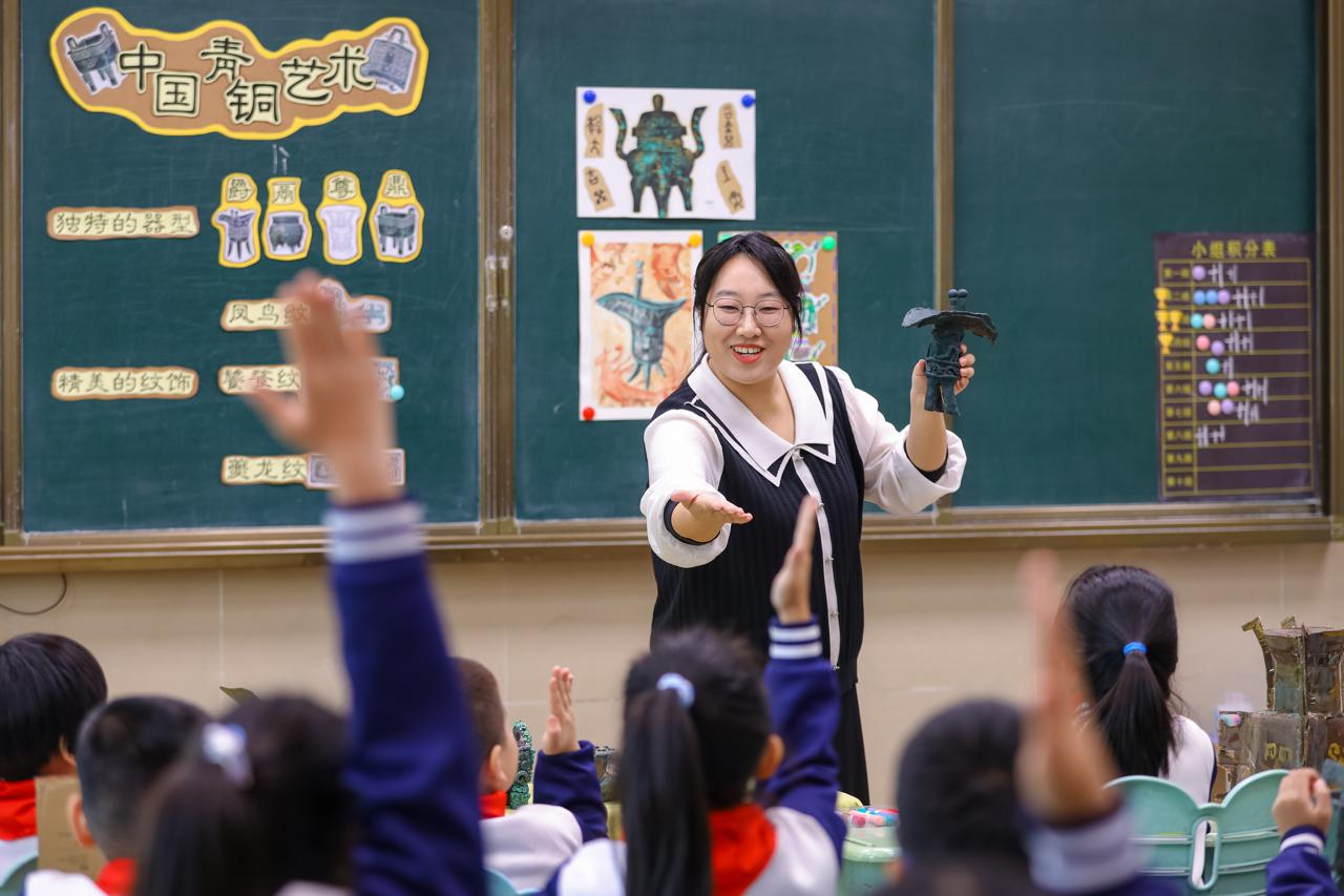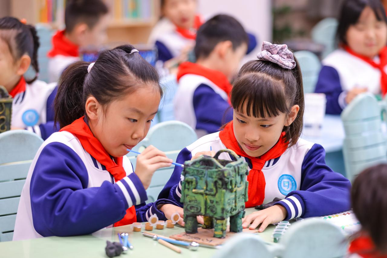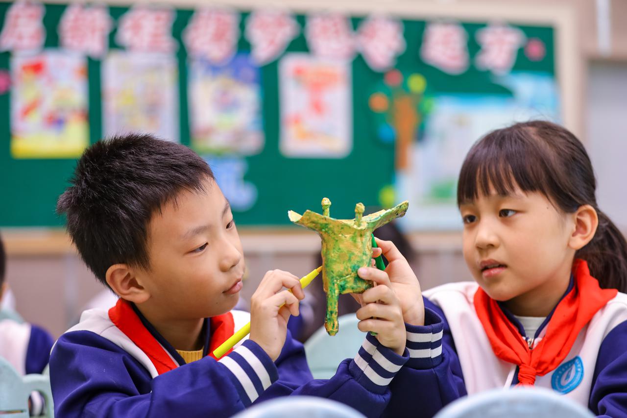 在山东省青岛市李沧区实验小学,学生利用太空泥、纸制品制作青铜器文物模型。通讯员 张鹰 摄