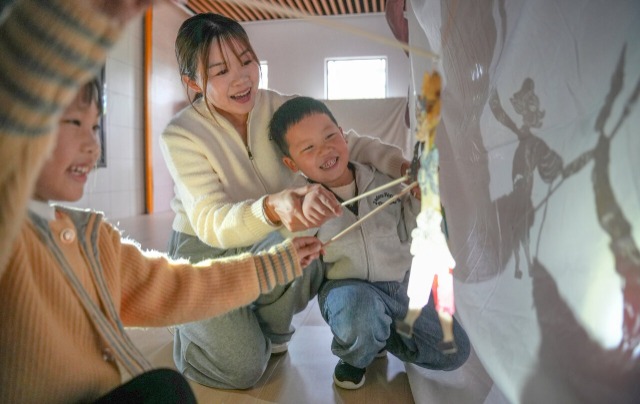 10月28日,浙江省湖州市长兴县煤山镇白岘中心幼儿园开展“乐享皮影戏 快乐学非遗”活动,老师们指导小朋友学习皮影表演技艺,带领小朋友了解相关的非遗知识,让他们感受民俗文化的魅力,丰富校园生活。中国教育报-中国教育新闻网通讯员 陈海伟 摄