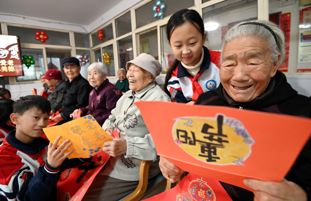学生将自制的贺卡赠送给老人。通讯员 郝群英 摄
