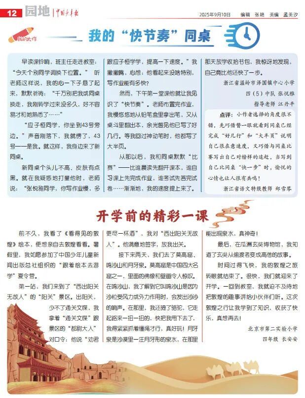 早读课铃响,班主任走进教室: “今天个别同学调换下位置。” 听老师这样说,我的心一下子悬了起来,默默祈祷:“千万别把我或同桌换走,我刚转学过来没多久,好不容易才和她熟悉了……” “应子恒同学,你坐到43号旁边。”声音刚落下,我就愣了,43号——是我。就这样,我身边来了新同桌。新同桌个头儿不高、皮肤有点黑。就在我疑惑地打量他时,老师说:“张悦雅同学,你写作业慢,多跟应子恒学学,提高一下速度。”我撇撇嘴,心想:他看起来没啥特别,写作业能有多快?然而,下午第一堂课他就让我见识了“快节奏”。老师布置完作业,我慢悠悠地从铅笔盒里拿出笔,又从桌斗里翻出本,余光瞥见他已写了好几行。等我回过神动笔时,他都写了大半页。从那以后,我和同桌默默“比 赛”——比谁晨读先翻开课本,谁自习课上先完成作业,谁考试先答完试卷……渐渐地,我的速度提上来了。那天放学收拾书包,我惊讶地发现,自己竟比他还快了一步。
