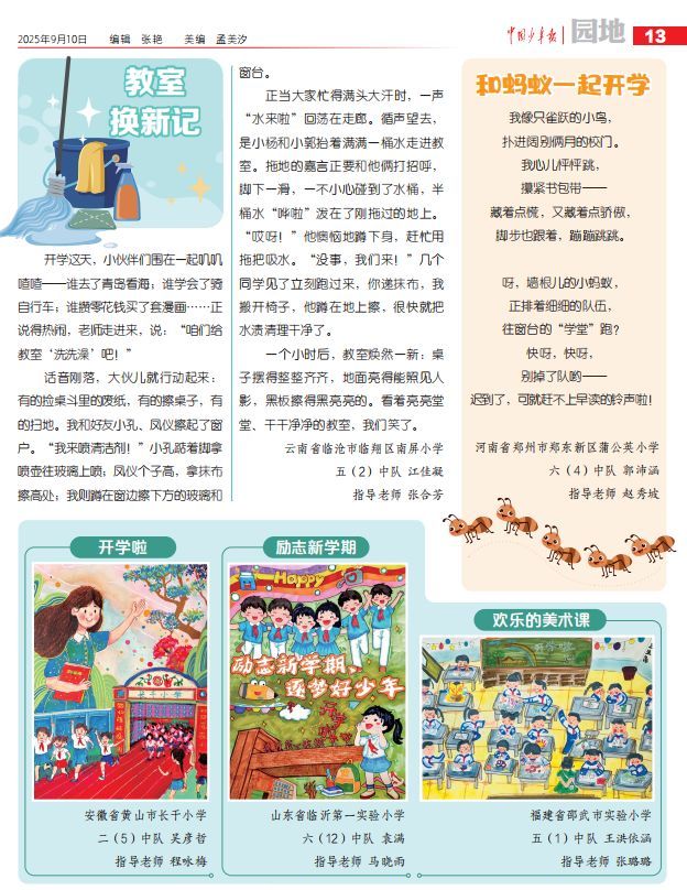 开学这天,小伙伴们围在一起叽叽喳喳——谁去了青岛看海;谁学会了骑自行车;谁攒零花钱买了套漫画……正说得热闹,老师走进来,说:“咱们给教室‘洗洗澡’吧!”