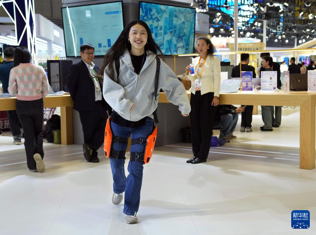 11月6日,在第八届进博会技术装备展区,参观者体验穿戴机械外骨骼运动。