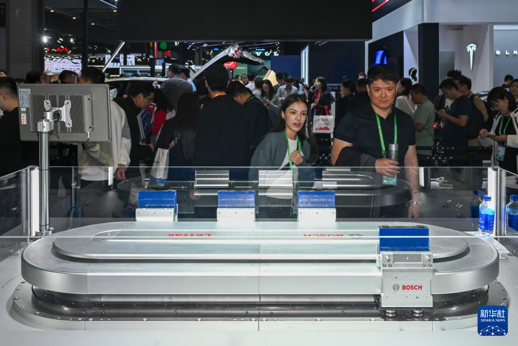 11月6日,在第八届进博会汽车及智慧出行展区博世展台,人们在展品LeTrak®磁驱柔性传输系统Pro版前交流。