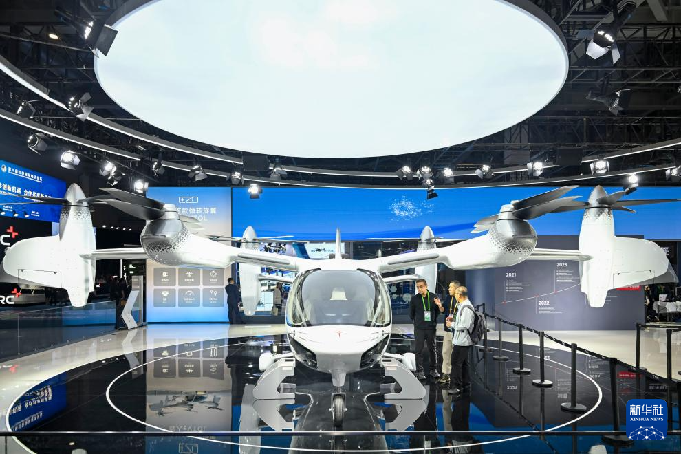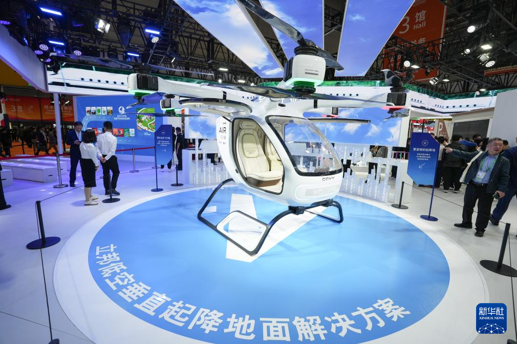 11月6日,在第八届进博会汽车及智慧出行展区的科技展台,展商(中)在向观众介绍E20 eVTOL电动垂直起降飞行器。