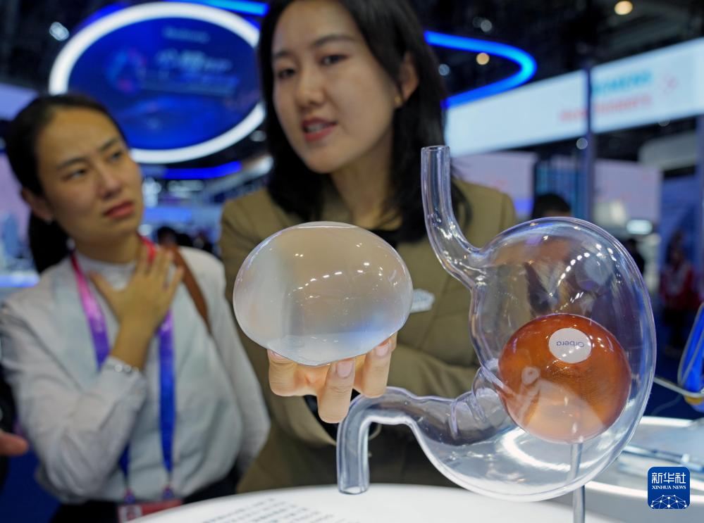 11月6日,在第八届进博会医疗器械与医疗保健展区,工作人员在介绍减重创新产品Orbera365胃内球囊,可通过内窥镜从口腔送入胃内以占据胃容积,减少患者进食量,增强饱腹感,以实现减重。