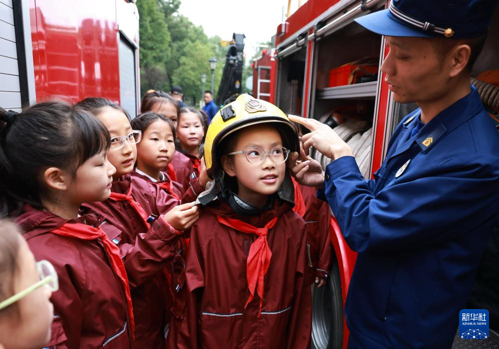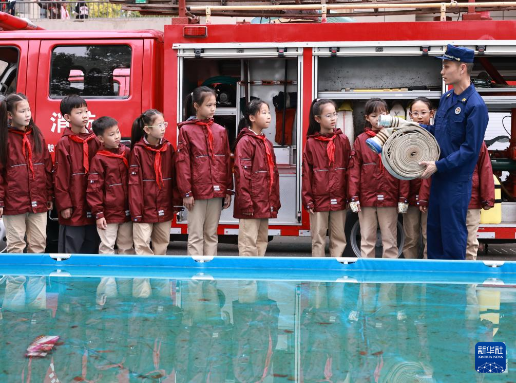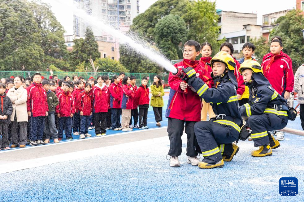 11月7日,在湖北省武汉市武昌区中山路小学紫都二分校,学生在消防救援队员指导下体验使用消防设备。