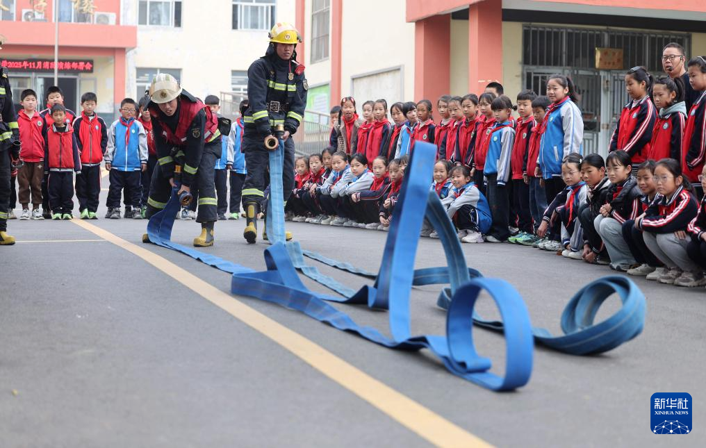 11月7日,在山东省临沂市沂南县铜井镇鲁家庄中心小学,沂南县消防救援大队的消防救援人员给学生们展示消防水带的使用方法。
