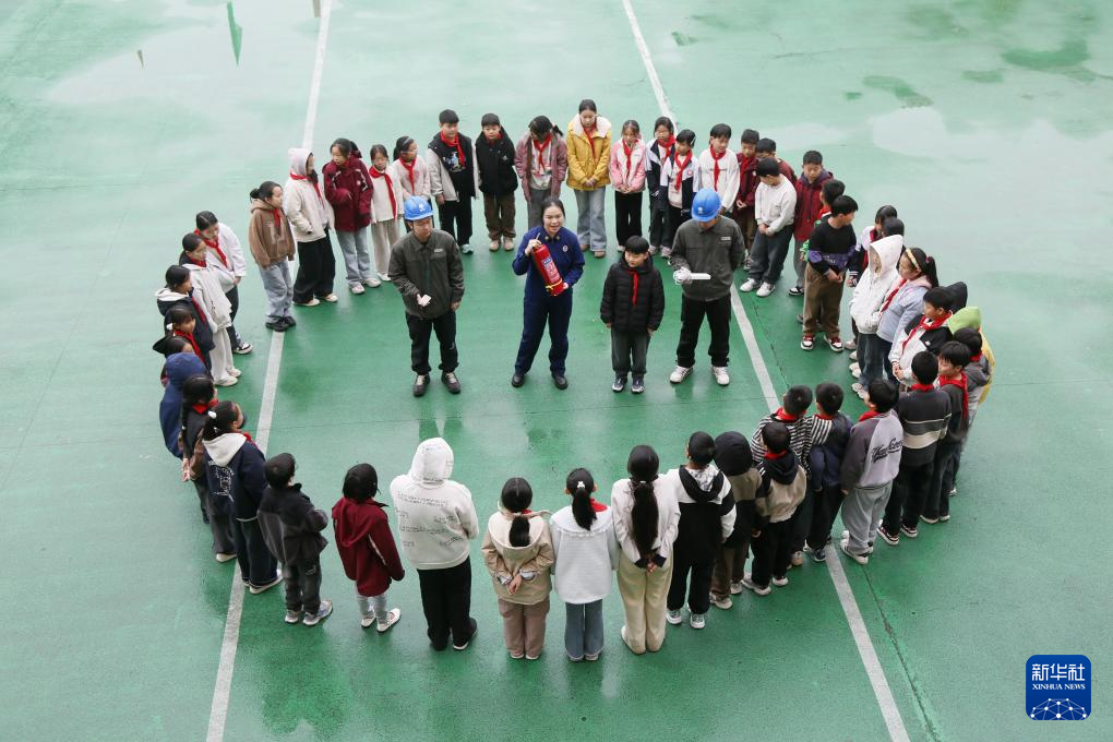 11月7日,贵州省安顺经济技术开发区消防救援大队消防员在安顺经济技术开发区实验小学指导学生使用消防水枪。