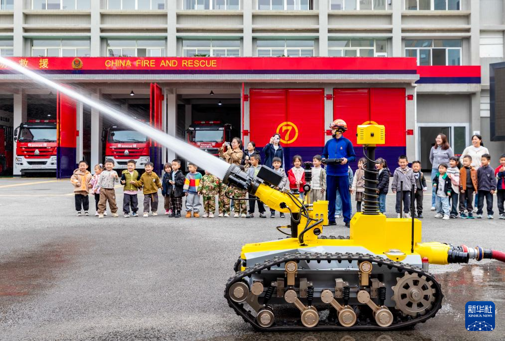 11月7日,在贵州省黔西市消防救援大队,消防员给小朋友演示灭火机器人。