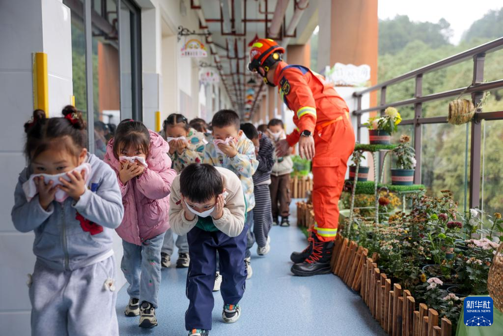 11月7日,贵州省开阳县第二幼儿园小朋友参加应急逃生演练。