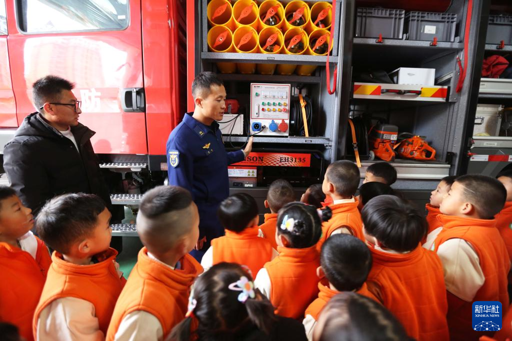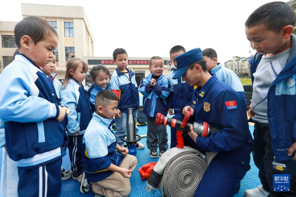 11月7日,在贵州省都匀市第五幼儿园,消防救援人员为小朋友介绍消防救援器材。