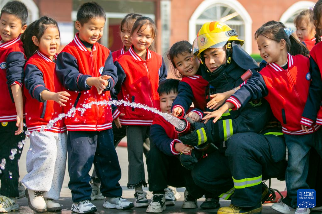 11月5日,在河南省商丘市睢县消防救援大队,小朋友体验使用消防水枪。