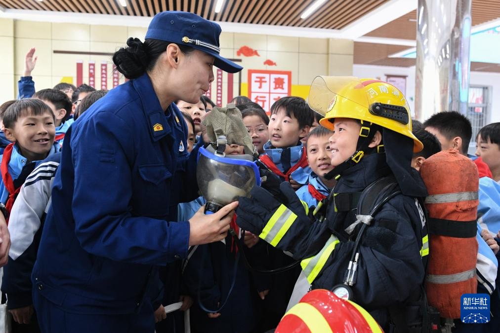 11月7日,在河南省商丘市夏邑县育才学校,夏邑县消防救援大队消防员指导学生体验使用消防装备。