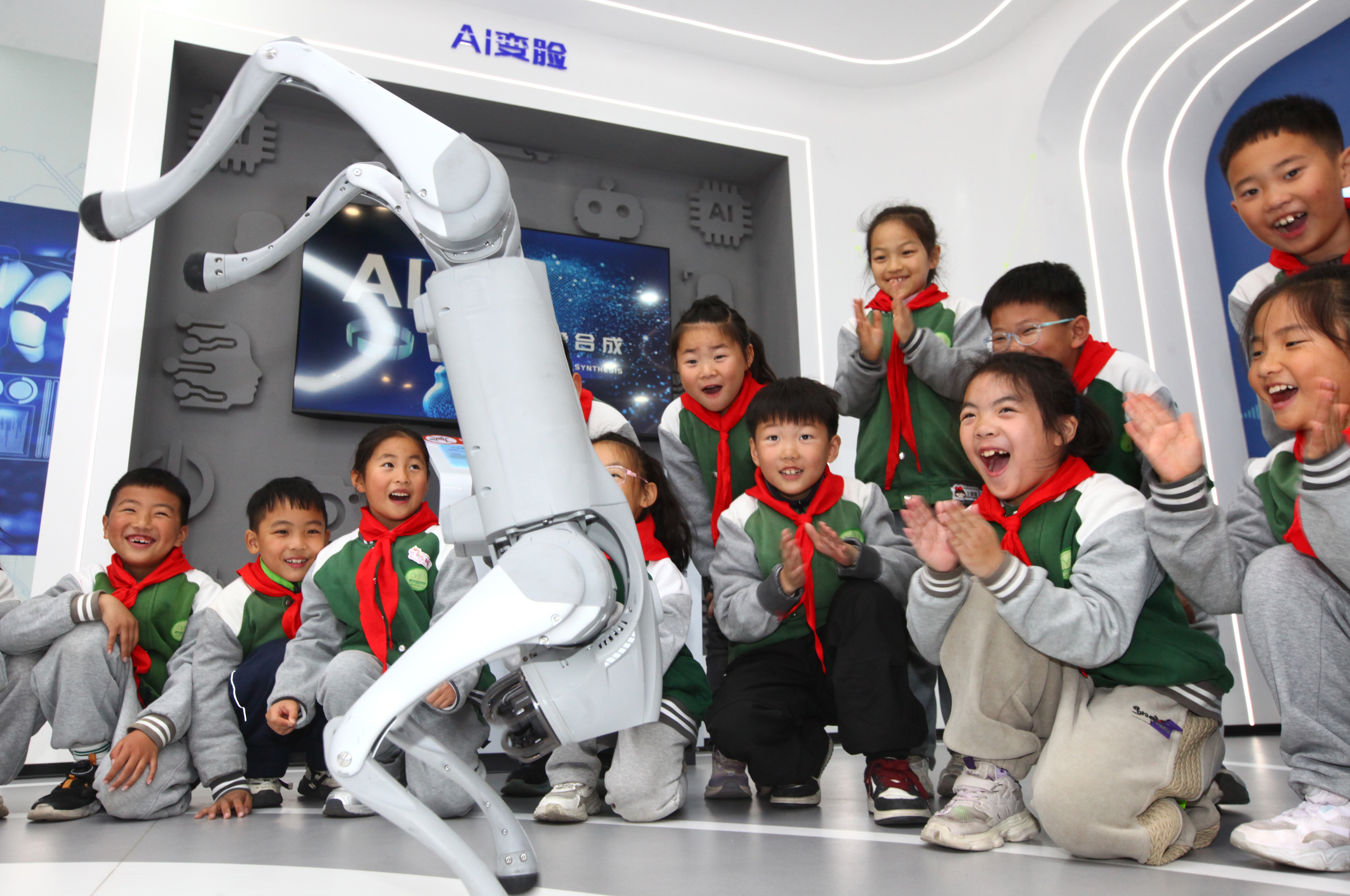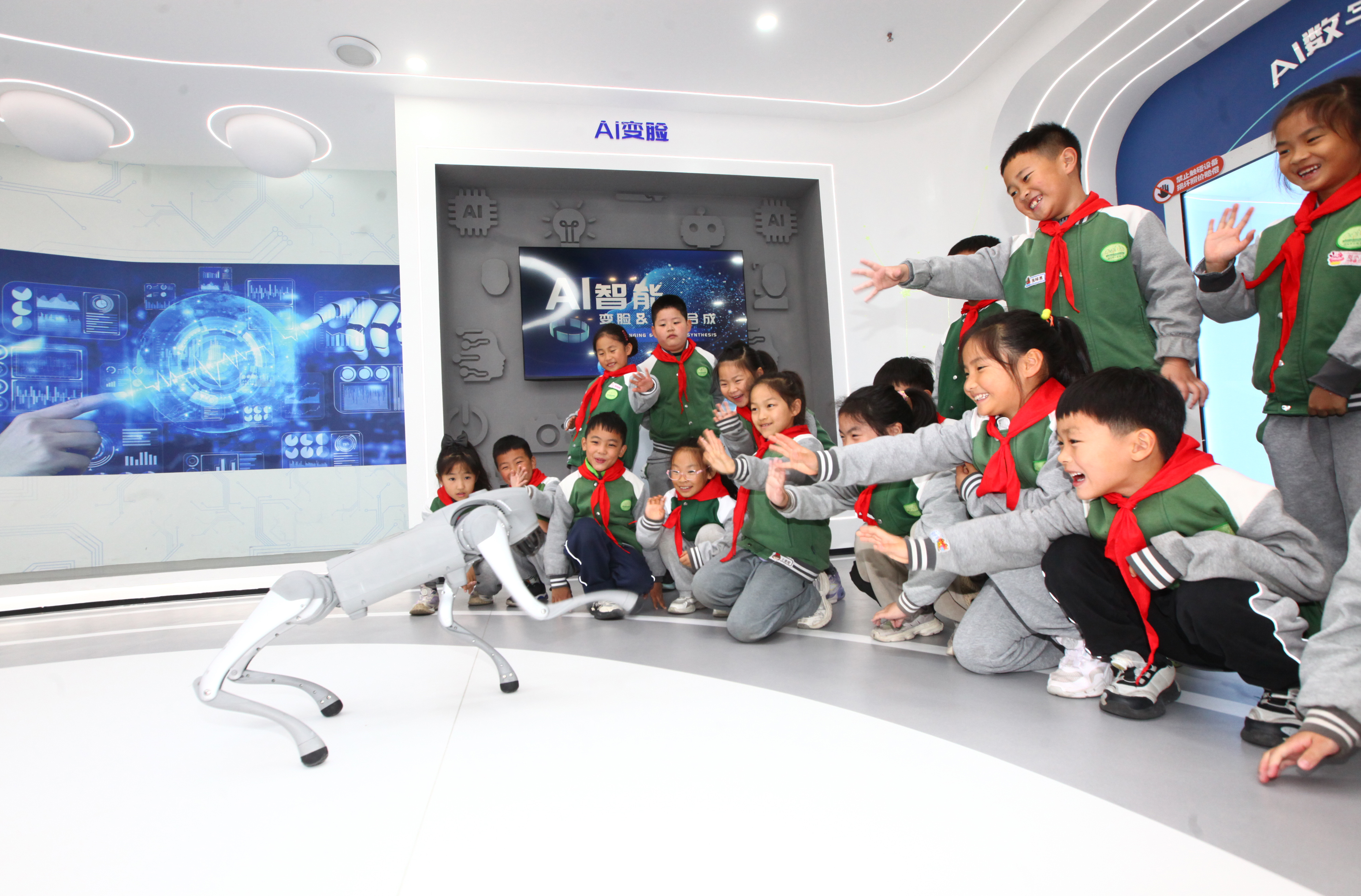 江苏省徐州市贾汪区潘安湖小学学生在徐州市一家科技馆观看机器狗表演。通讯员 蒯创 摄