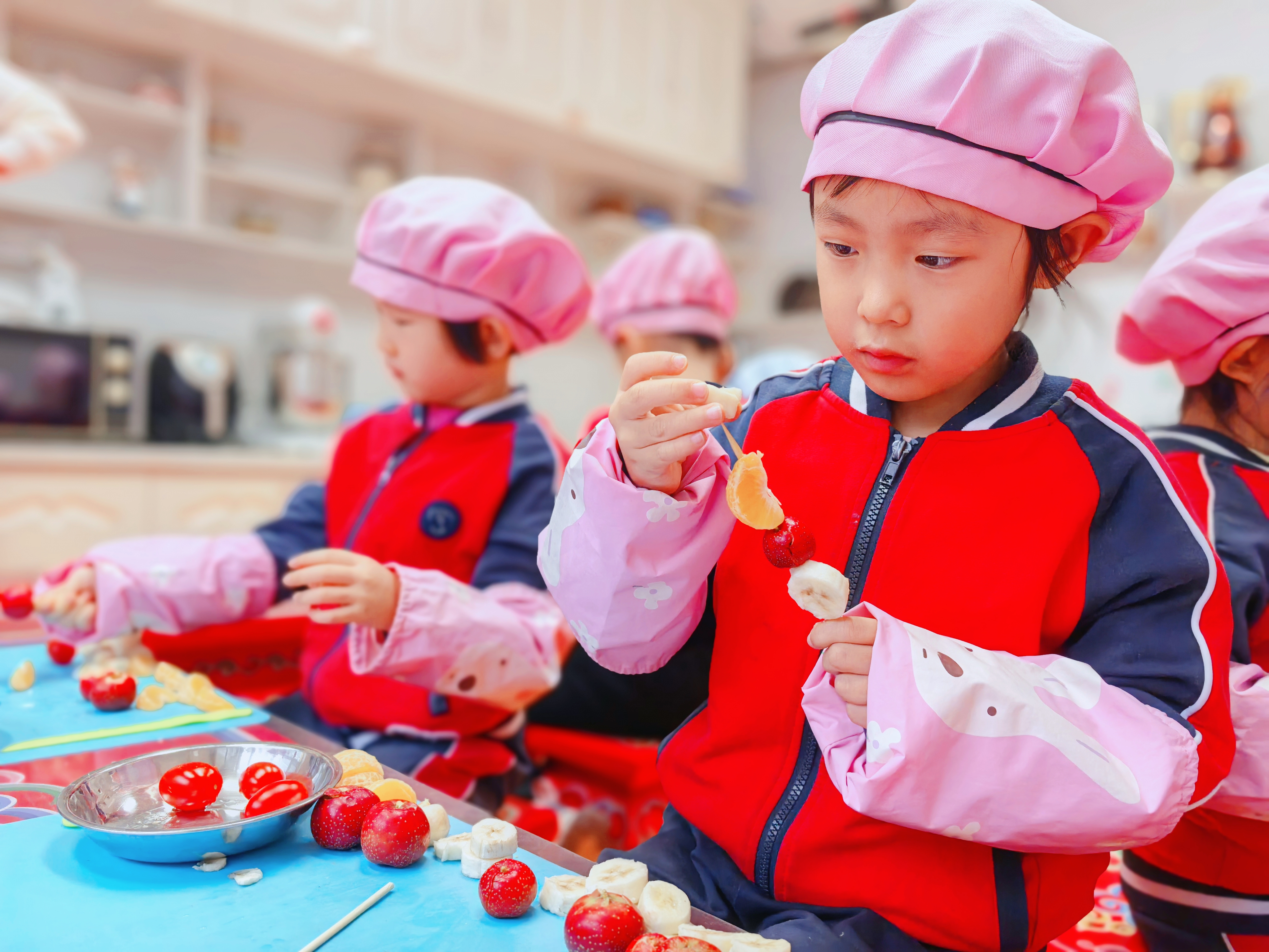 内蒙古包头市昆都仑区包钢幼教处第七幼儿园小朋友在认真的串糖葫芦。聂文娟郭斐斐摄