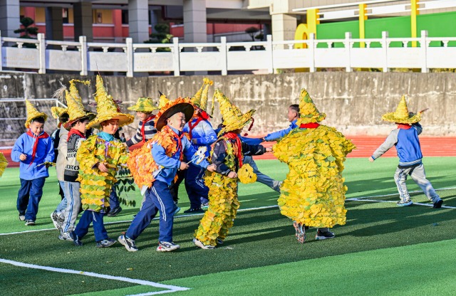 11月21日,湖北省十堰市竹山县恒升小学“快乐成长工程”暨第八届体育文化节开幕式上,学生身着用银杏叶、枫叶、金菊等材料制作的服饰集体亮相,惊艳校园。中国教育报-中国教育新闻网通讯员 石濡华 郭莹莹 摄