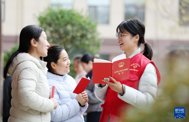 12月2日,在山东省临沂市郯城县郯城街道泉悦社区,郯城县司法局志愿者为居民讲解宪法知识。新华社发(张春雷摄)