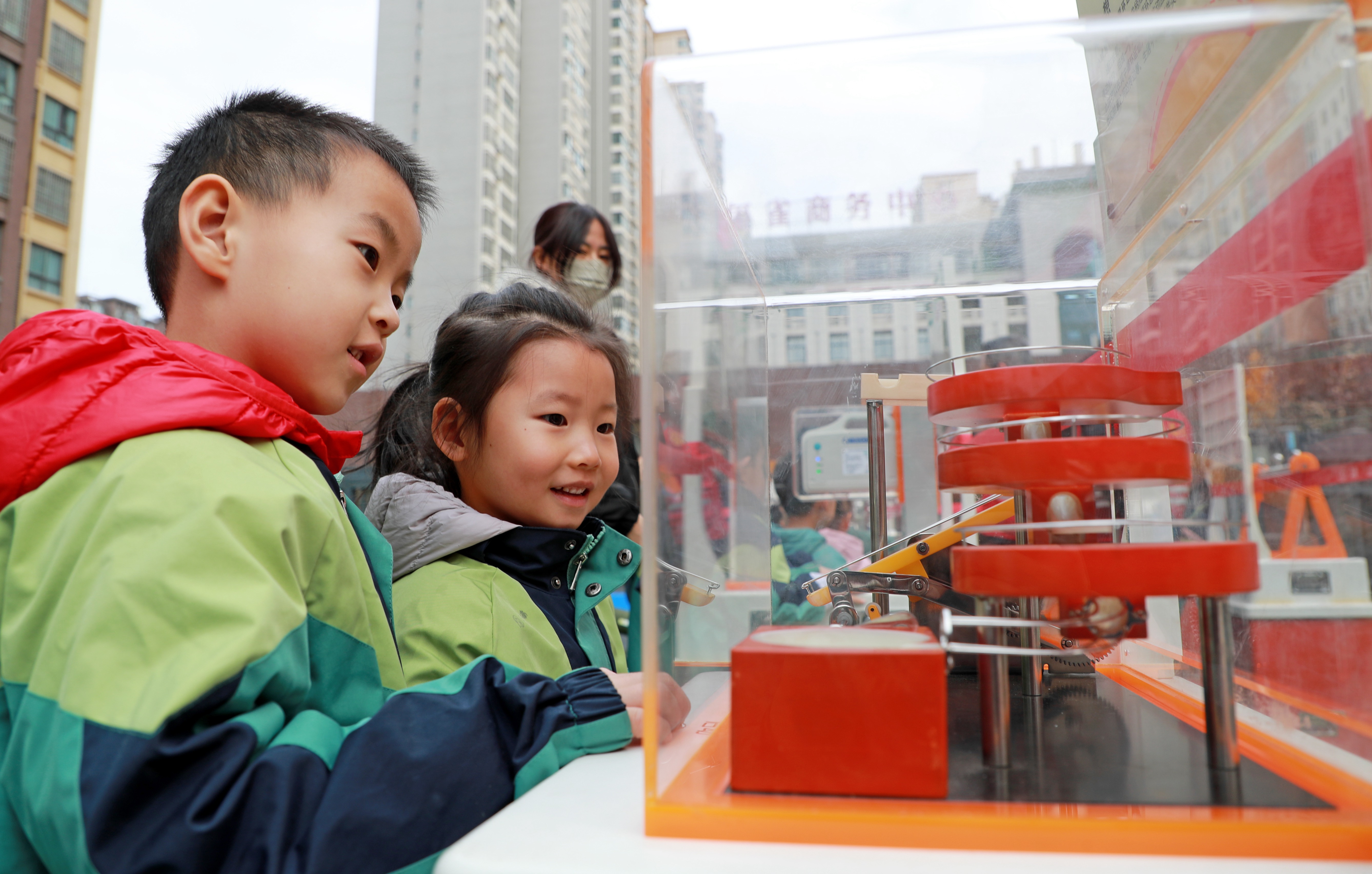 在陕西省渭南市临渭区苏园丰景幼儿园,小朋友体验科普大篷车展品“小球运动”。通讯员 崔正博 摄