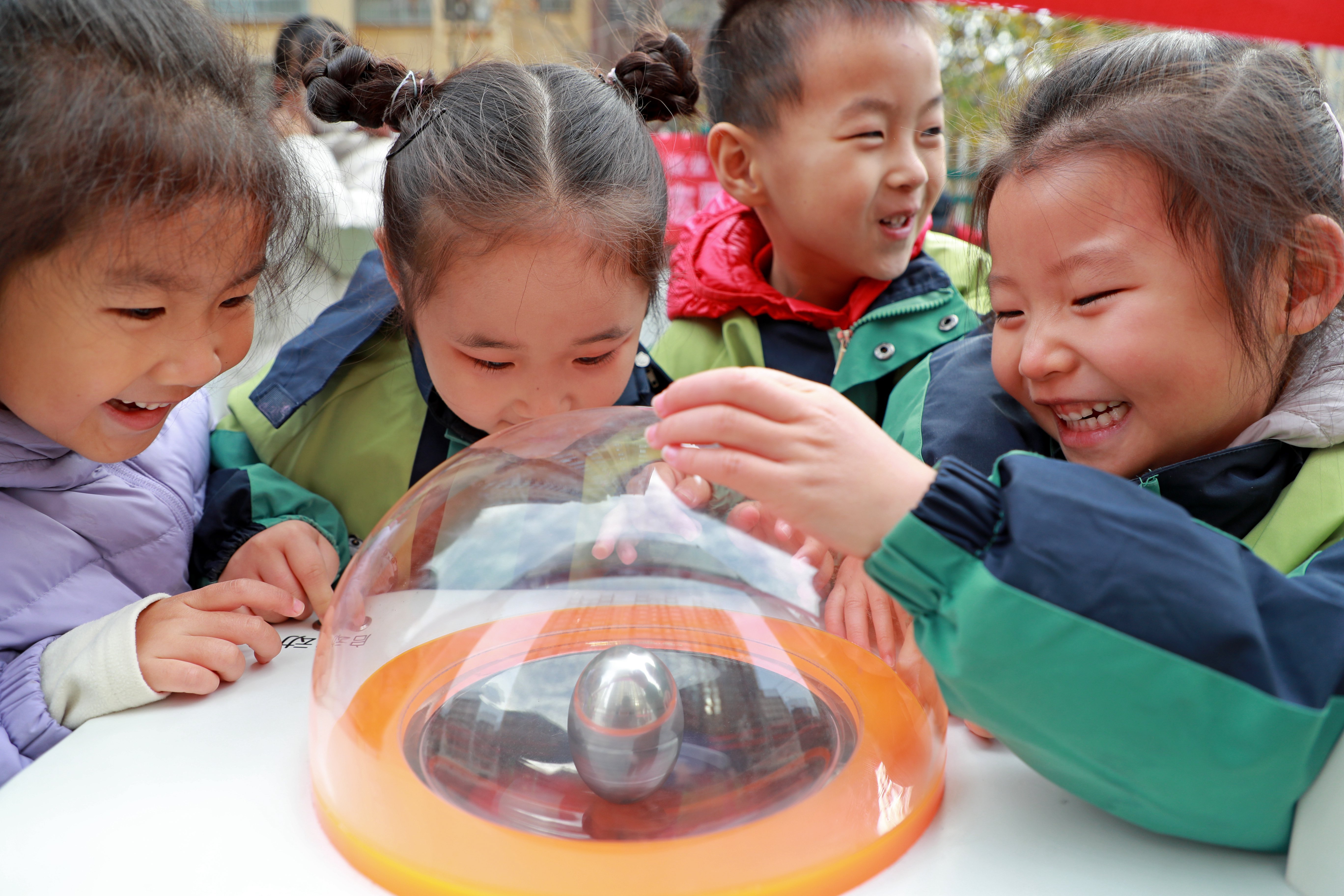 在陕西省渭南市临渭区苏园丰景幼儿园,小朋友体验科普大篷车项目“旋转的银蛋”。通讯员 崔正博 摄