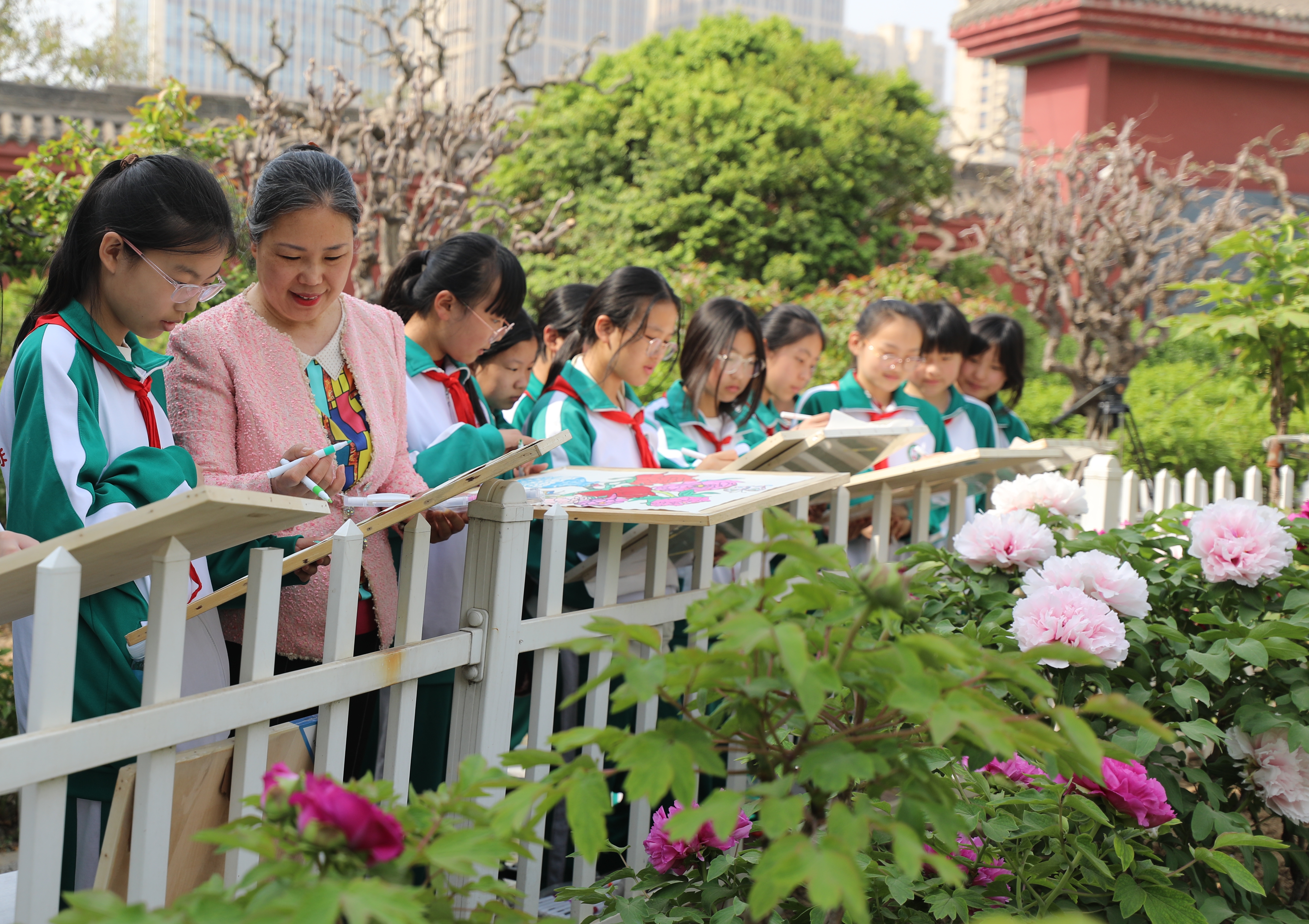 菏泽市牡丹区牡丹小学师生在当地牡丹园里写生