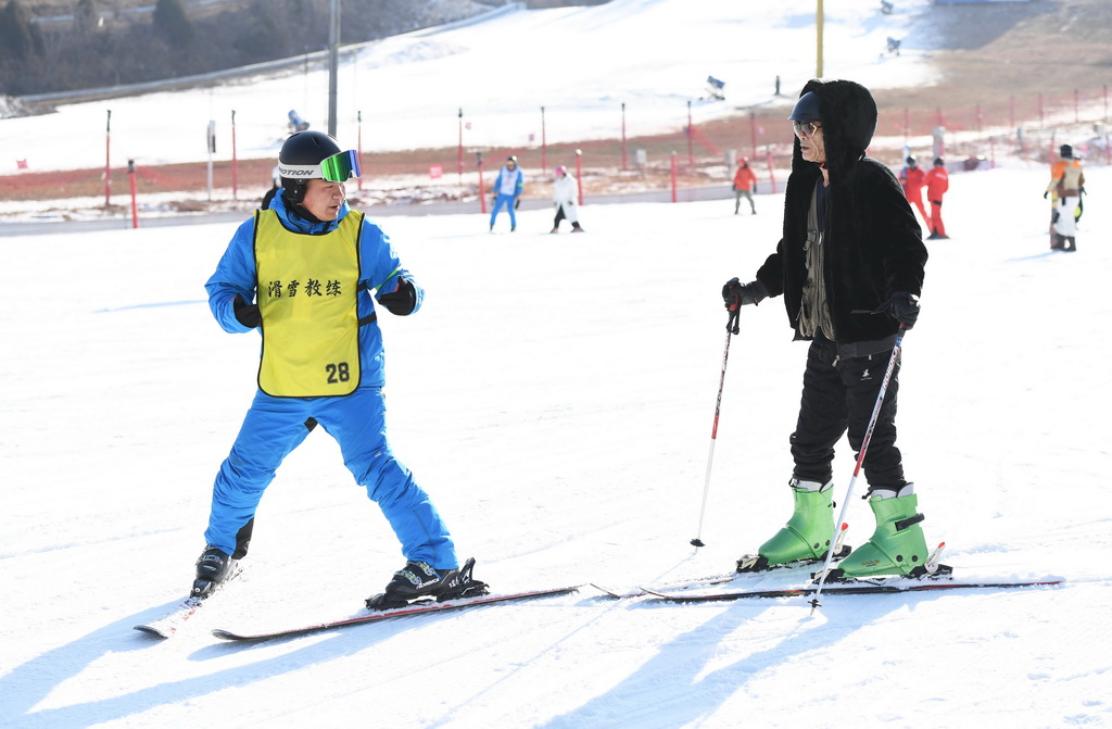 12月9日,市民(前右一)在北京渔阳国际滑雪场学习滑雪。