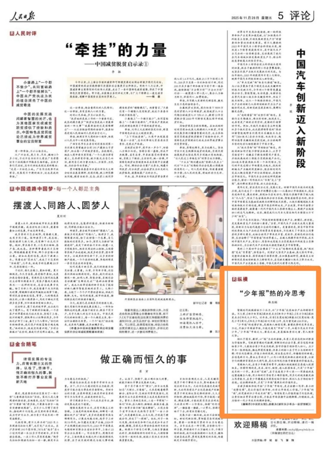 文章指出,智媒时代纸媒面临不小压力,而“少年报”这类细分产品却持续升温。“少年报”的逆势扩张,是媒体人转型突围、重塑优势的变革求索。不过,开拓少年阅读市场,不能光看见“市场”二字,而看不见成长中的少年。“少年报”市场之大、需求之旺,更显媒体责任之重、育人使命之坚。