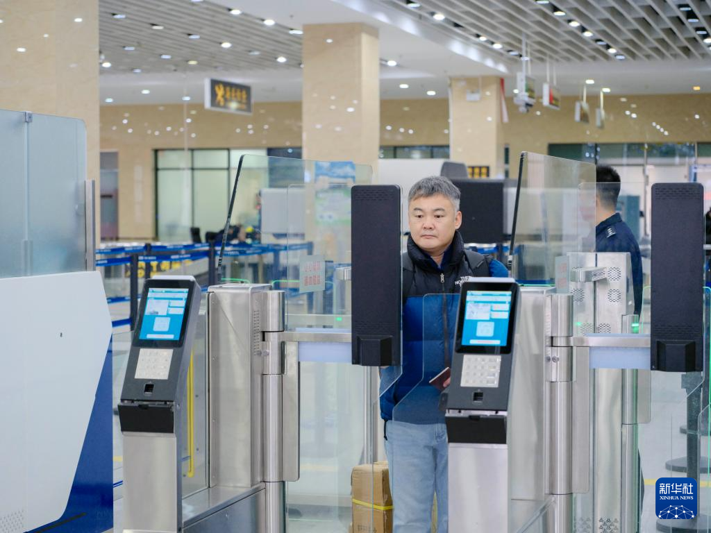 12月22日,在内蒙古二连浩特公路口岸联检大厅,旅客从快捷通道通关。