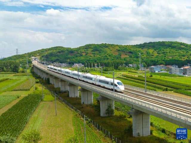 2022年6月20日,郑渝高铁实现全线贯通运营。这是列车行驶在郑渝高铁湖北省襄阳市东津新区境内(无人机照片)。